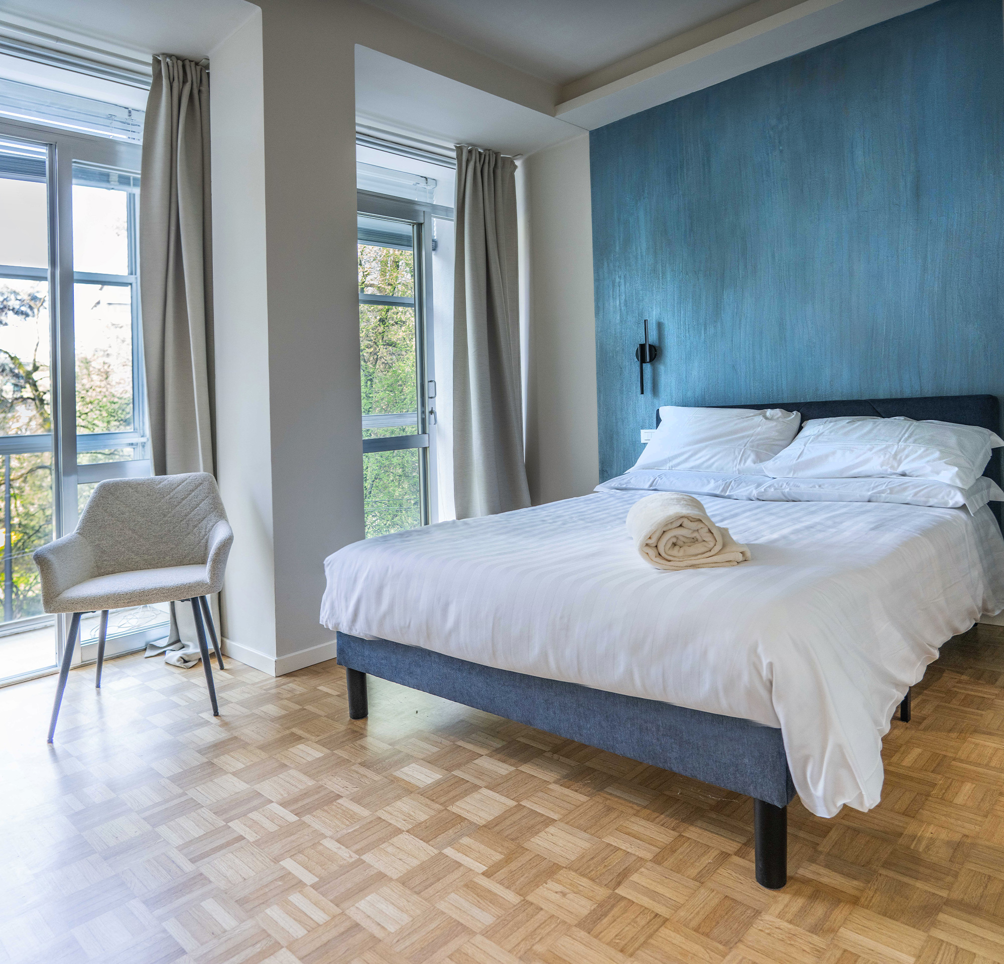 Camera matrimoniale ampia e luminosa, arredata in stile moderno con vista sui giardini di Piazza Roma. Gli arredi semplici donano alla stanza un’atmosfera sobria e moderna.